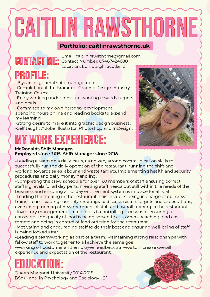 I’ve always enjoyed art, however I never knew that I wanted to make a career out of it. I remember when i was young playing with glitter glue and pipe cleaners then I moved on to drawing and painting. Years later I got my iPad and Apple Pencil where I discovered procreate, then this led to my interest in graphic design and the adobe creative suite. I was obsessed with learning new software and teaching myself how to use them by spending hours on Skillshare and watching several YouTube tutorials. I have continued to create passion projects to develop my skills. I am currently expanding my knowledge and continuously learning new aspects of design studying a HND at Edinburgh College in Visual Communication: Graphic Design.