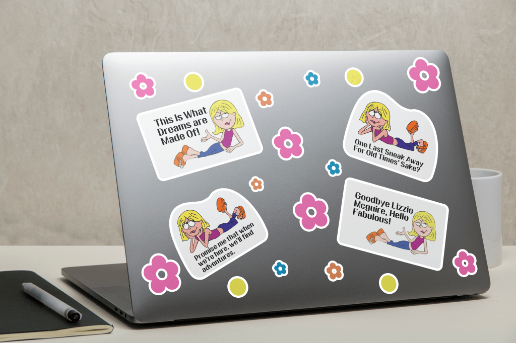 I created these stickers for use on laptops, water bottles, phone cases etc, these are my favourite quotes from the movie and also some of the most iconic stand outs. These stickers would be sold on a sheet with the flowers and circle shape shown on the laptop below.