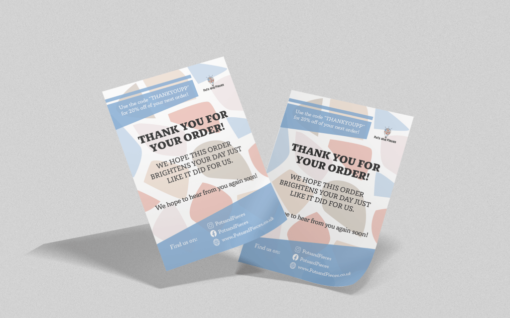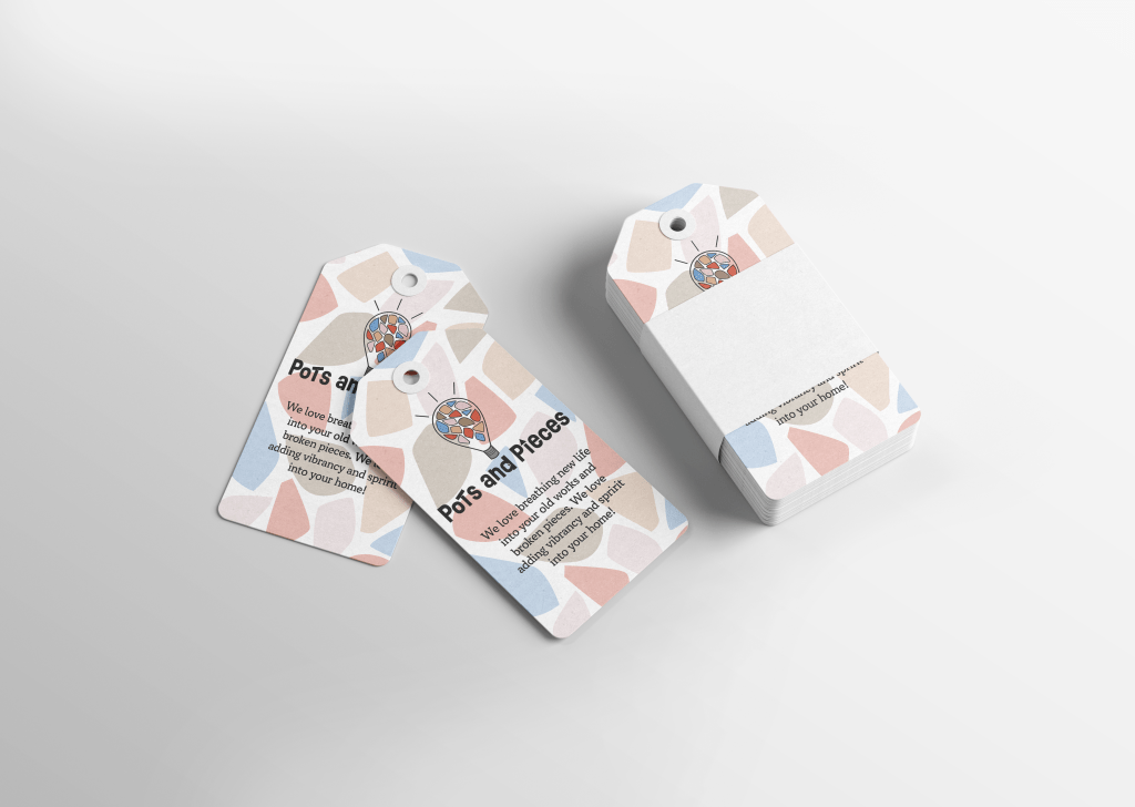 The inspiration for this branding was the uneven shapes of clay found when a clay item smashes, it also creates a mosaic vibe to the design. This abstract shaping is found in the brand pattern found in the flyer and the packaging tag. The shapes on the flyer behind the text also indicate the uneven shapes, this creates an element of interest and creates the message that each item this company produces is slightly different and a bit out of the ordinary.